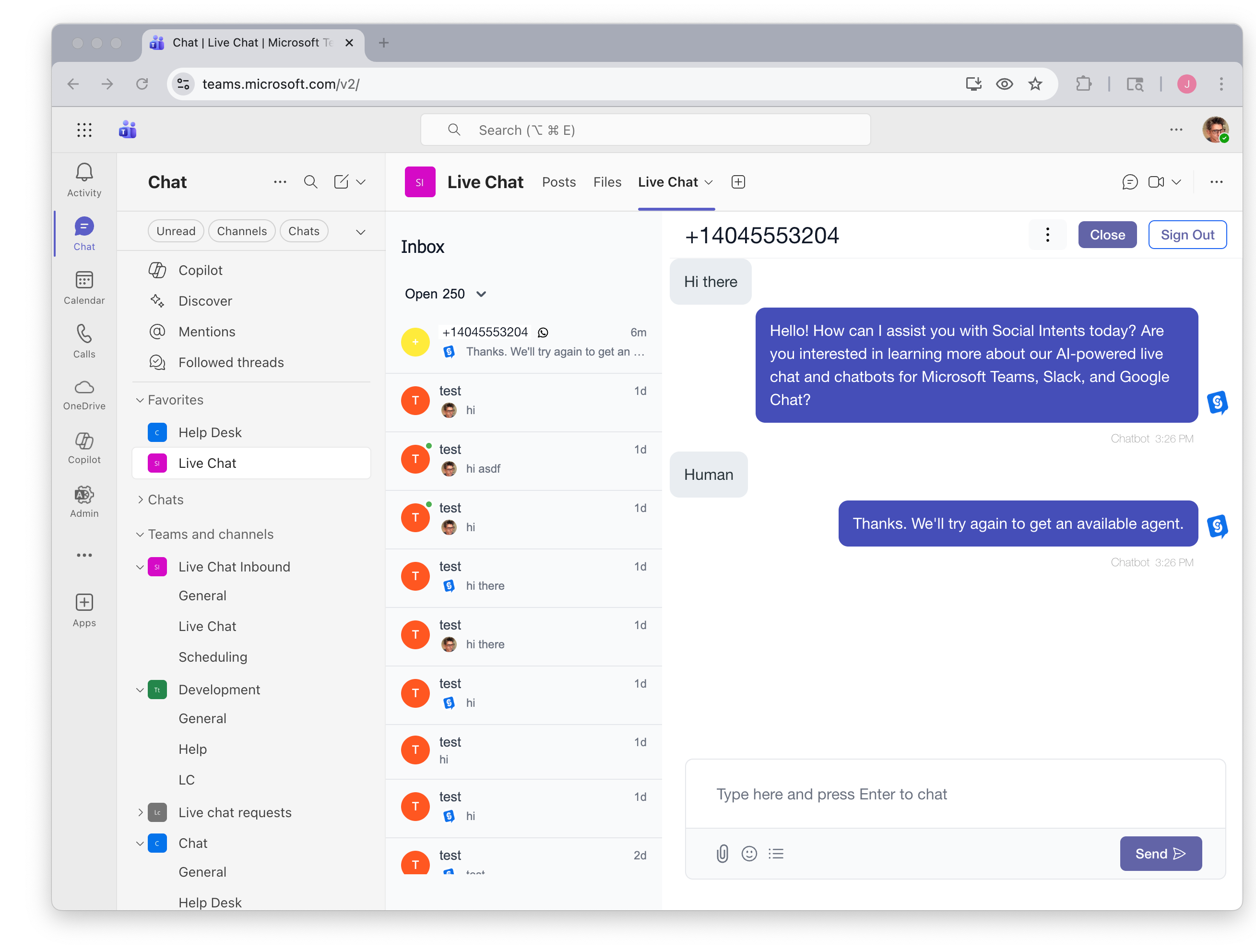 Select the Team and Channel where you want SMS messages to appear. After you grant permission, Social Intents posts new SMS messages in that channel automatically. When you click on the Live Chat tab in your application, you'll see an Inbox where you will receive your messages.